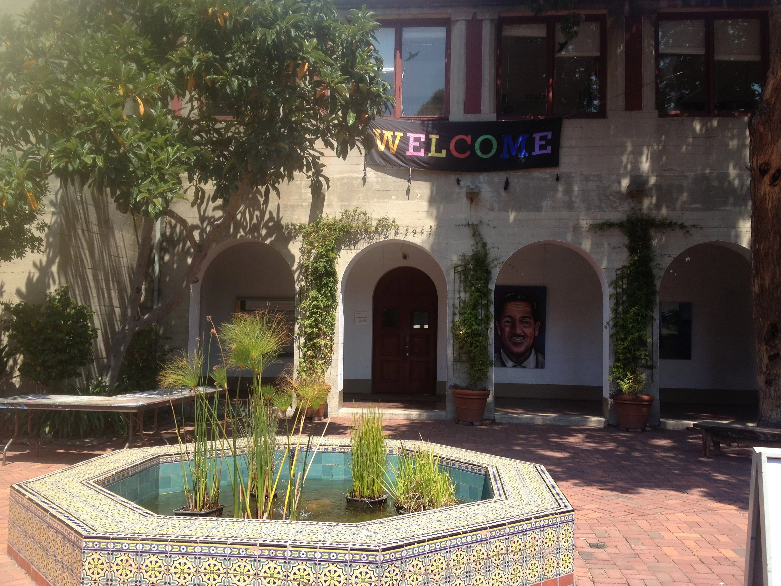 SFAI courtyard with new semester welcome banner for incoming students, 2015, San Francisco , CA