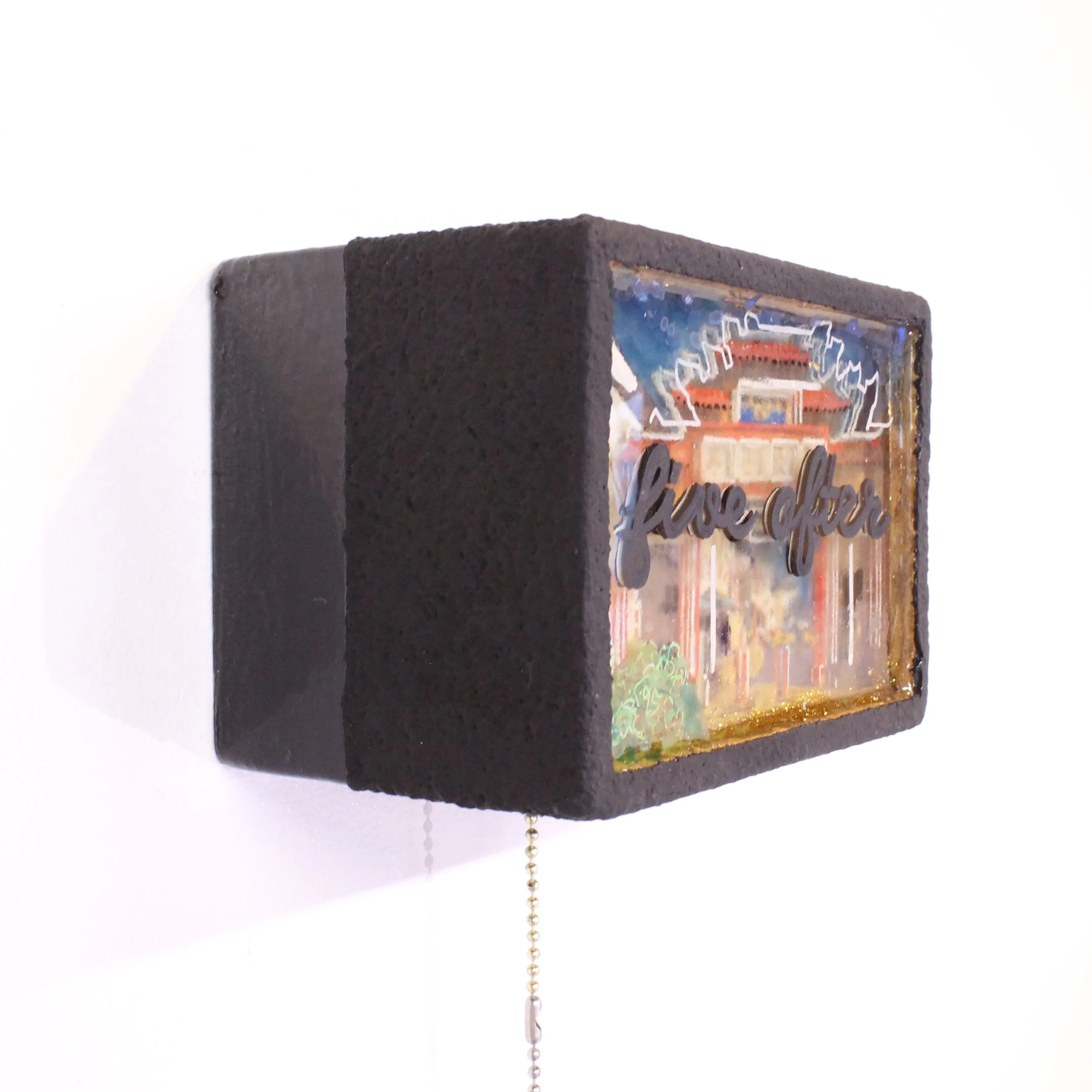Intimate in size, this artwork's composition draws reference from various motifs throughout the 20th-century art historical canon. The layered object alludes to some of the artist's creative influences such as On Kawara, Ed Ruscha, & Mel Bochner. As overlapping layers of resin, glass, and acrylic paint intersect, they create 3D effects that offer diorama-like viewing experiences that play with light & space.