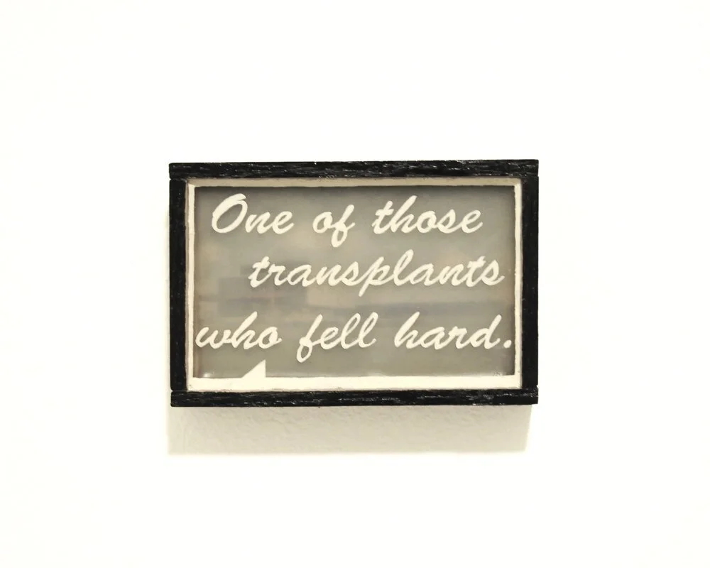 Utilizing similar materials and colloquial phrases like “this is some place” this artwork offers an ambiguous connotation that lingers somewhere between aww-struck sincerity, and tounge-in-cheek sarcasm.