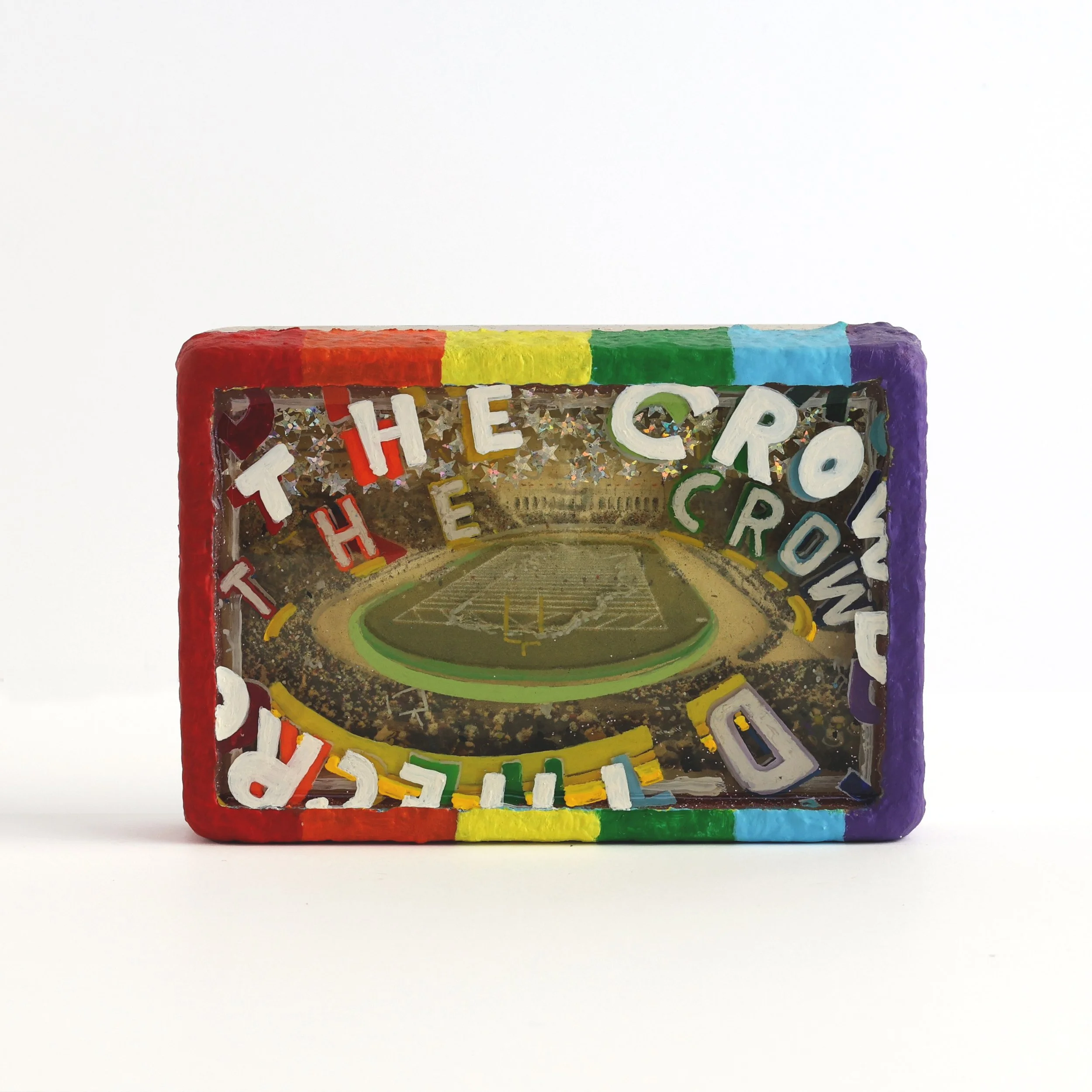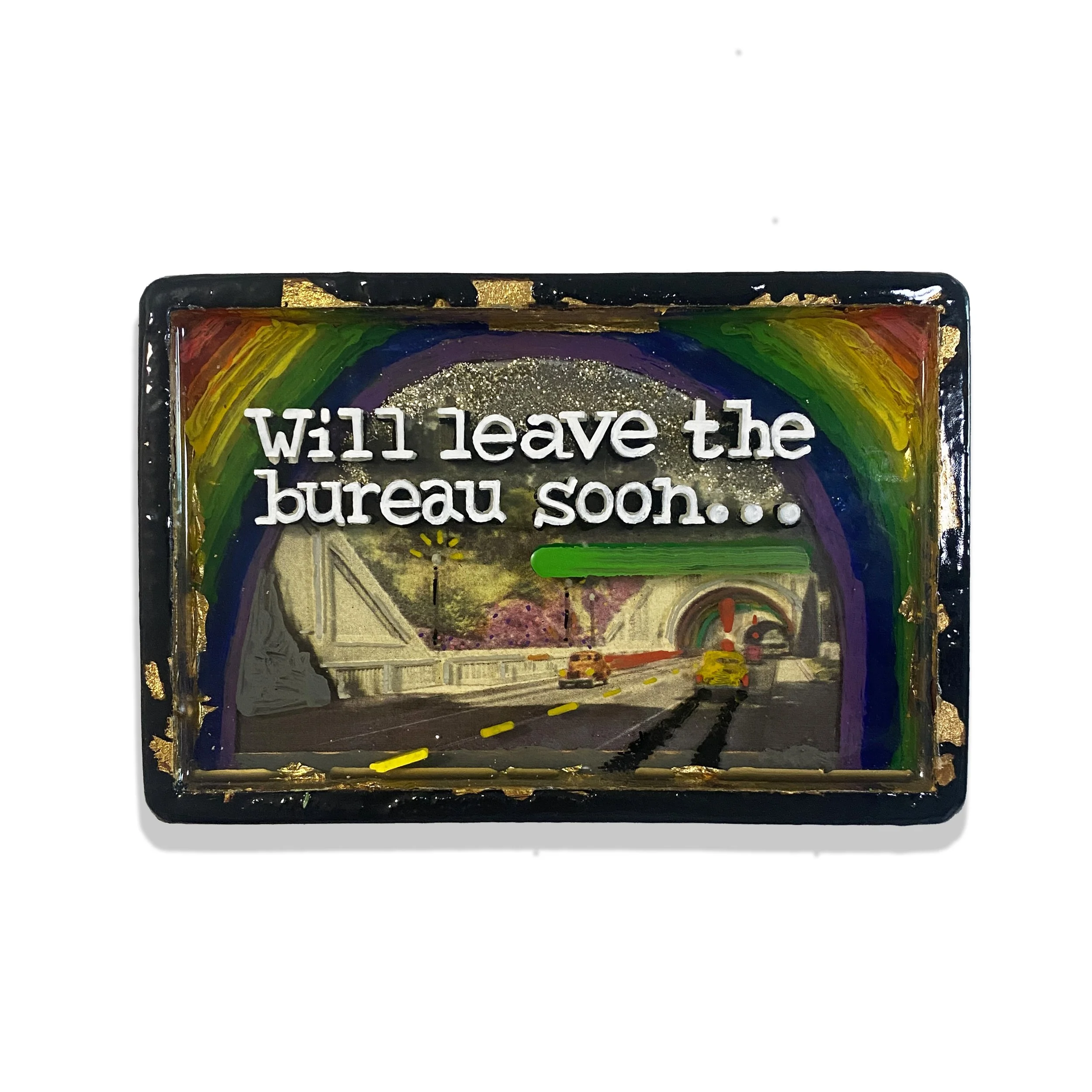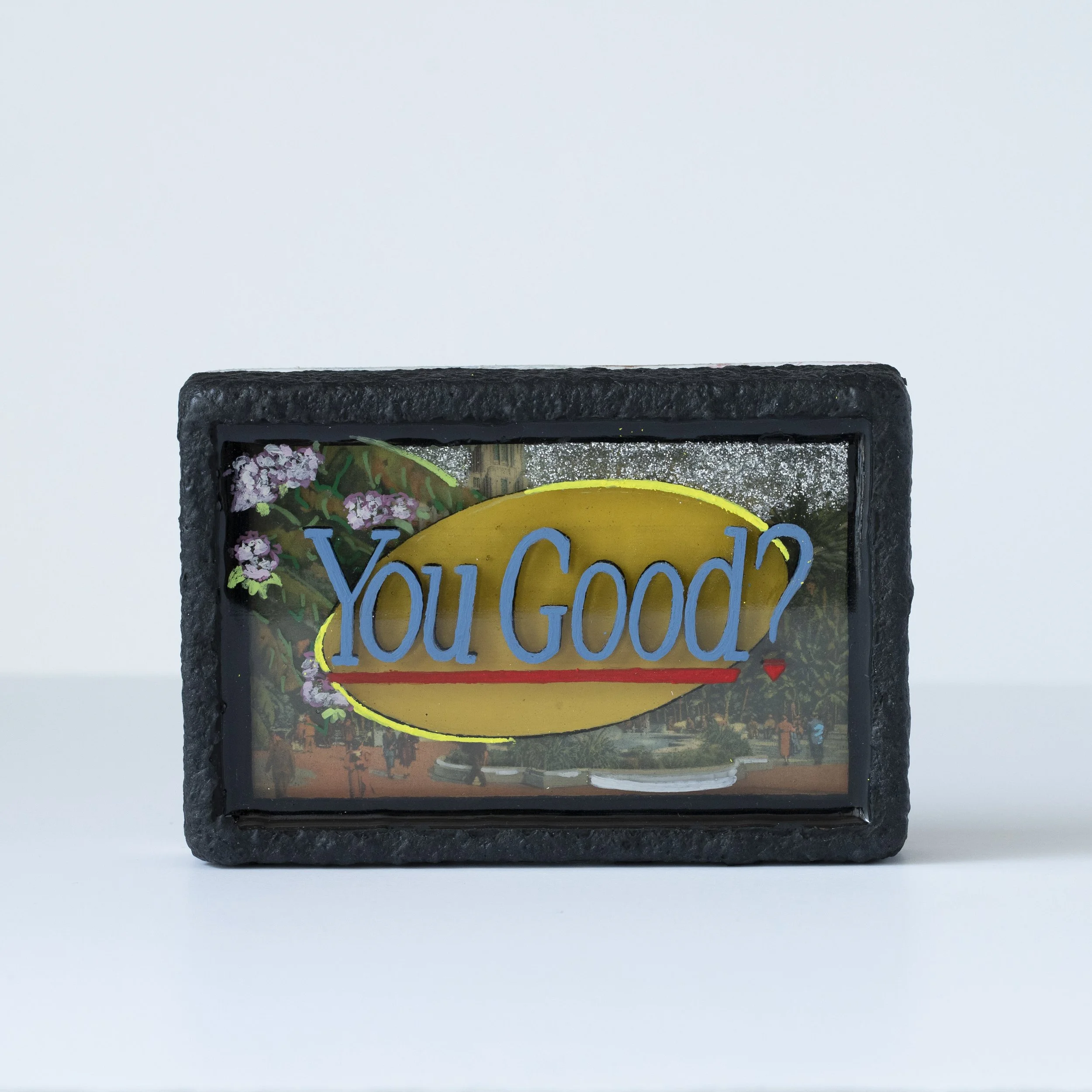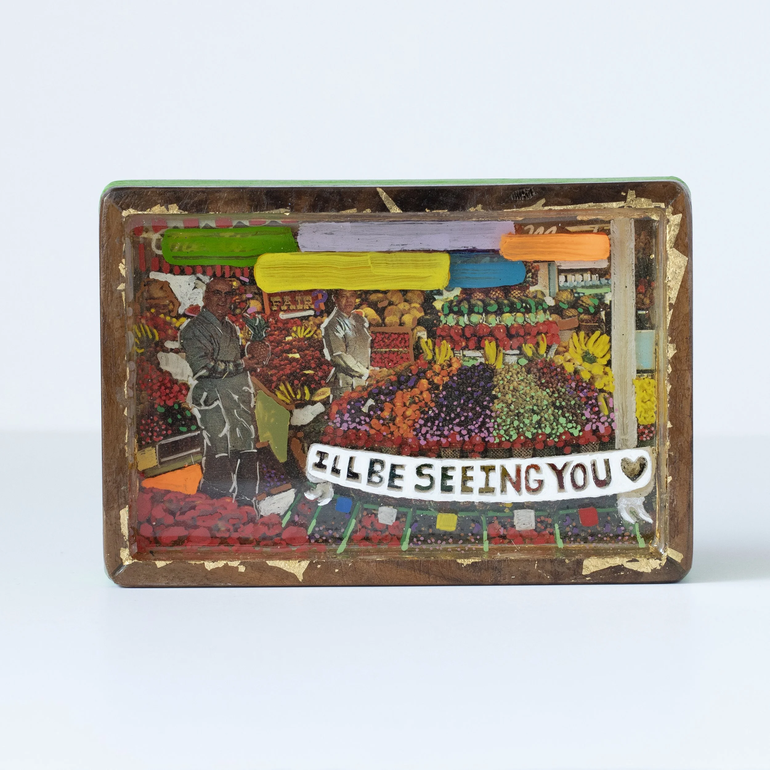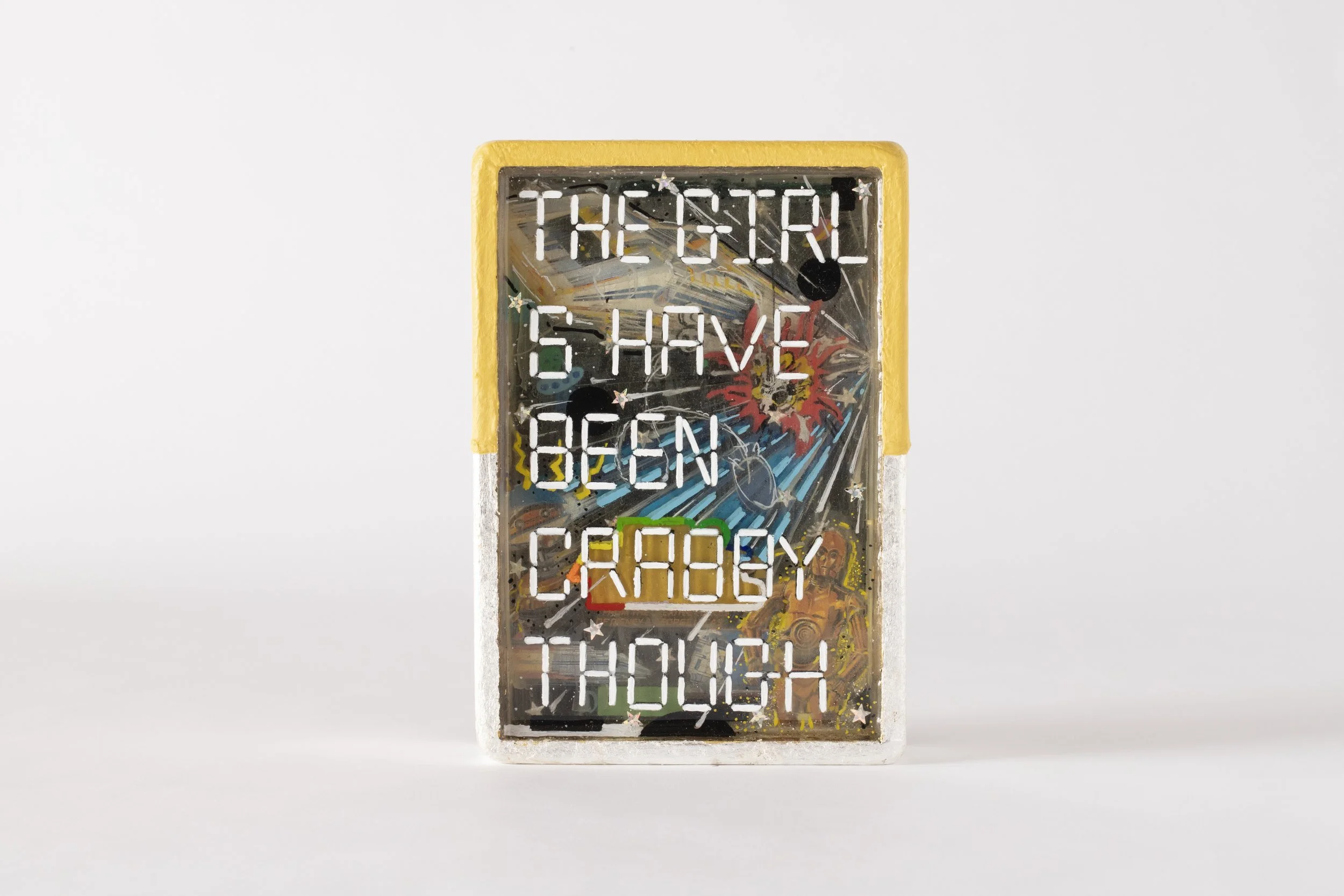 Intimate in size, this artwork draws reference from various visual motifs throughout the 20th-century. The layered object alludes to some of the artist's creative influences such as On Kawara, Ed Ruscha, & Mel Bochner. As the overlapping layers of resin, glass, and acrylic paint intersect they create a 3D effect that offers a diorama-like viewing experience.