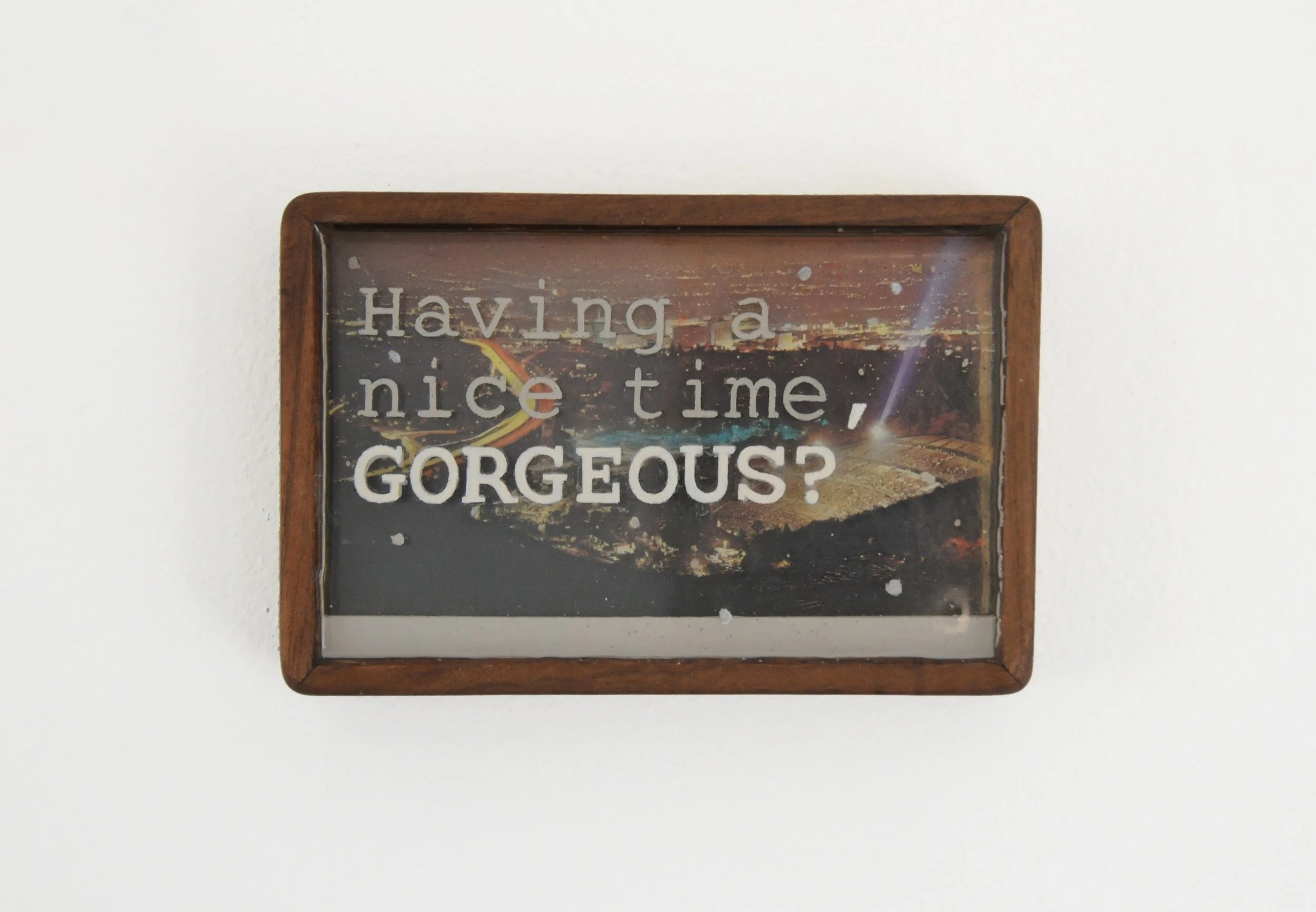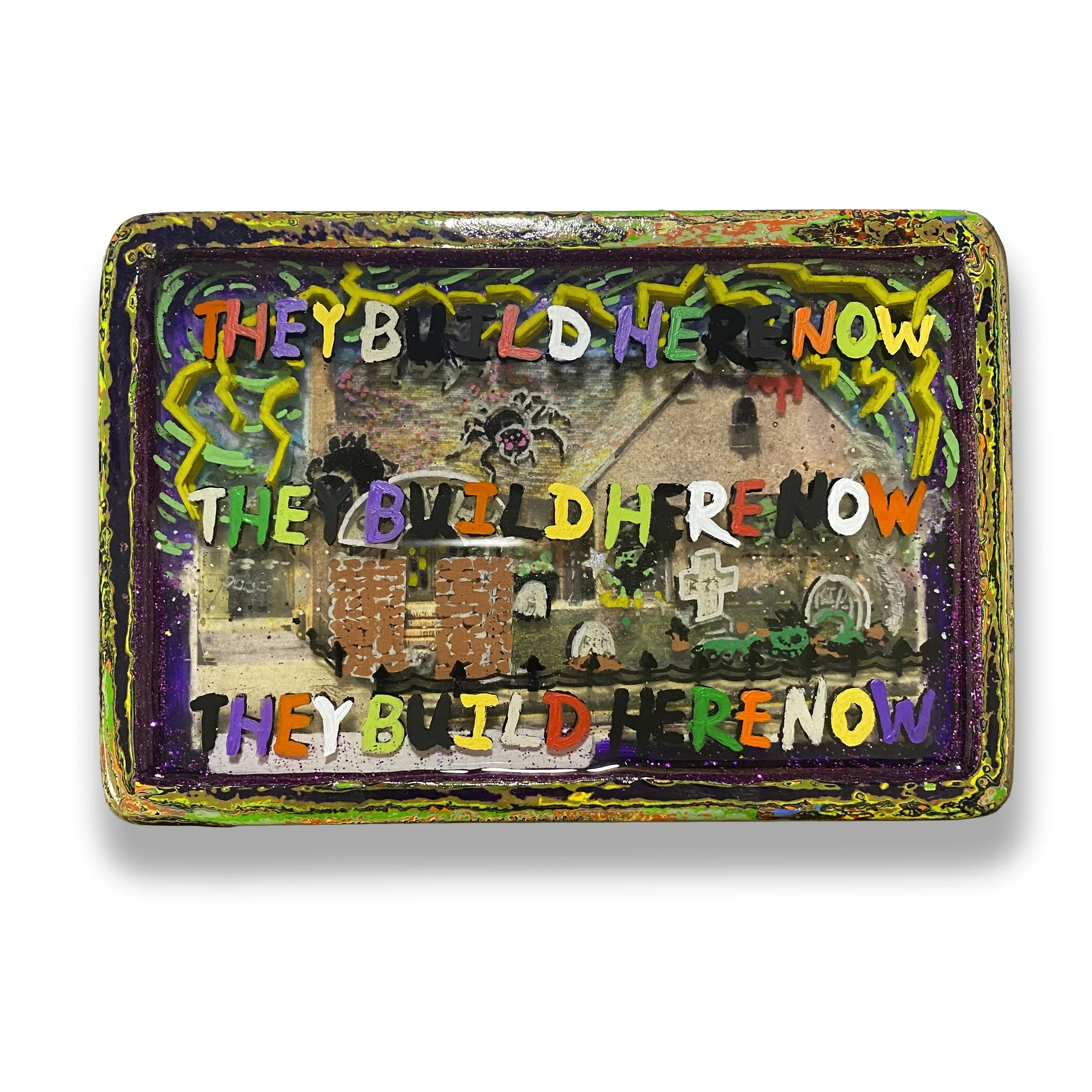 Acrylic paint and resin on vintage postcardThe quotation “they build here now” is taken from the postcard’s original sender as they describe the sprawling development of bungalow houses across the city of Los Angeles during the early half of the 20th century.